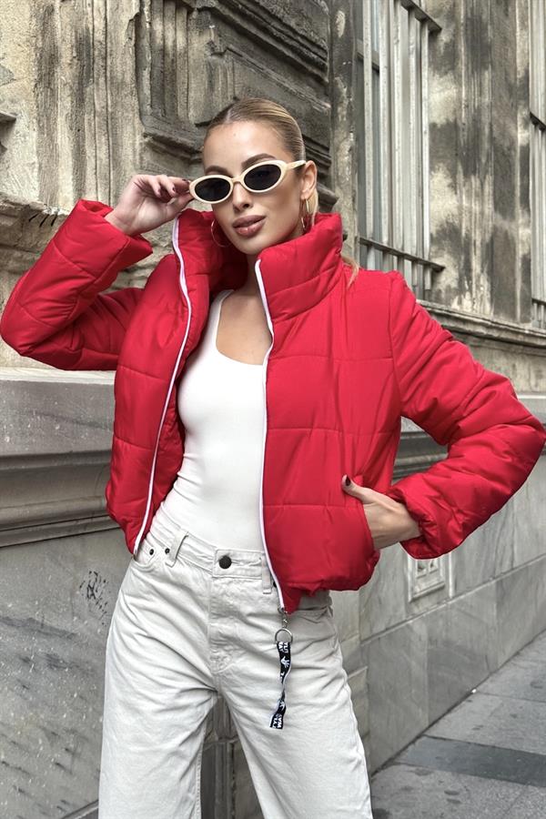 Kız Çocuk Kırmızı Sırtı Taş Baskılı Şişme Mont