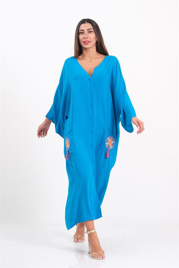 Kız Çocuk Saks Mavi Sırtı Taş Baskılı Dik Yaka Şişme Mont