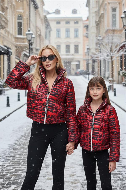 Kız Çocuk Kırmızı Parlak Yazılı Şişme Mont