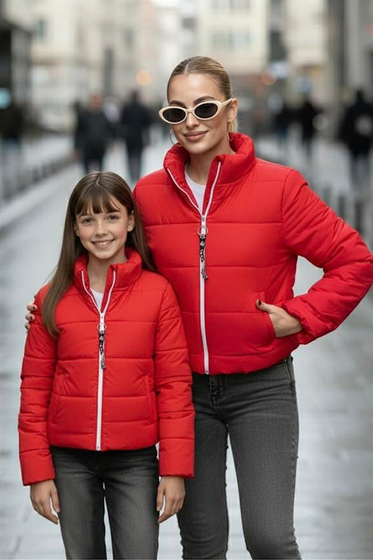Kız Çocuk Kırmızı Sırtı Taş Baskılı Şişme Mont