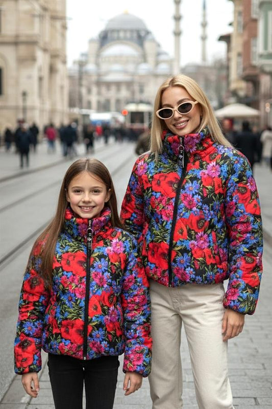 Kız Çocuk Mavi Dik Yaka Çiçekli Şişme Mont