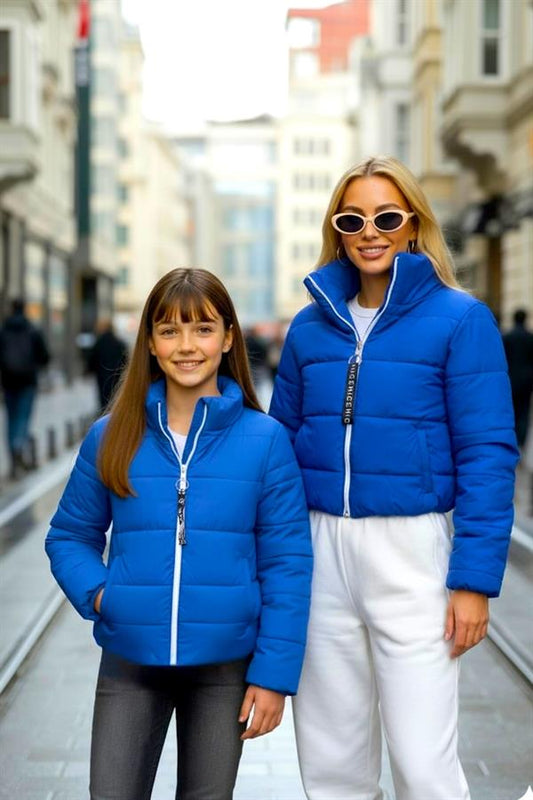Kız Çocuk Saks Mavi Sırtı Taş Baskılı Dik Yaka Şişme Mont