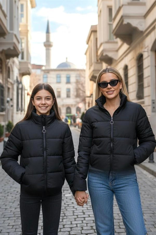 Kız Çocuk Siyah Sırtı Taş Baskılı Dik Yaka Şişme Mont