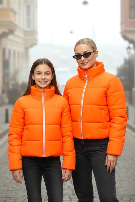 Kız Çocuk Turuncu Sırtı Taş Baskılı Şişme Mont