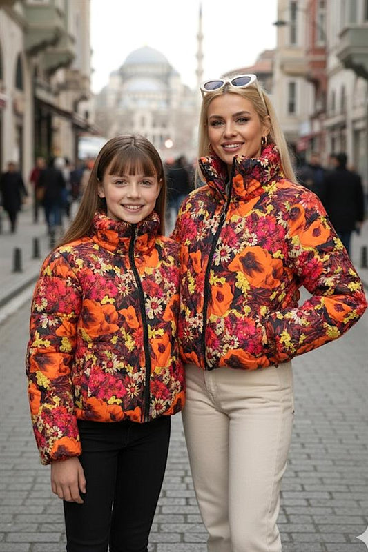 Kız Çocuk Turuncu Dik Yaka Çiçekli Şişme Mont