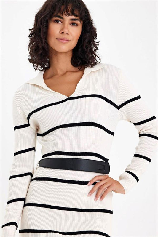 Beyaz Çizgili V Yaka Kemerli Diz Boyu Triko Elbise