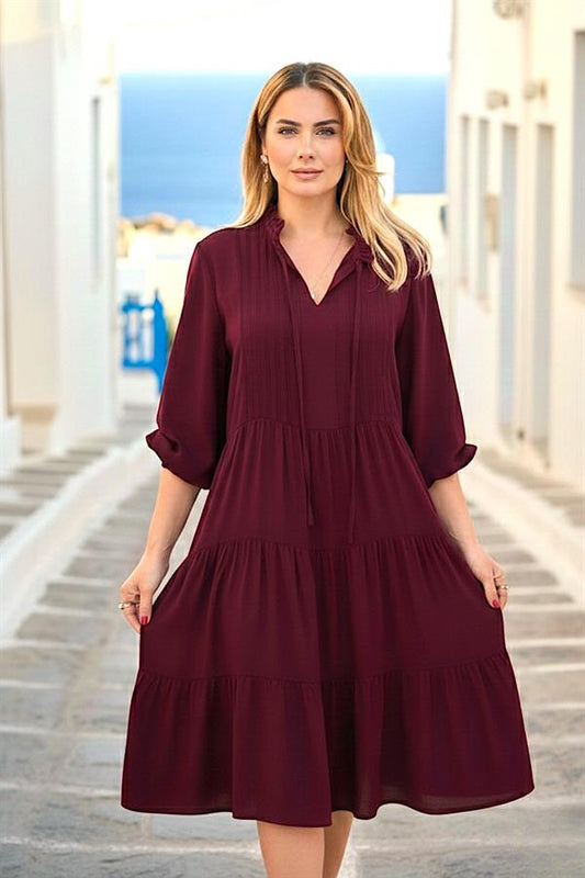 Bordo Bel Ve Yaka Bağlamalı Diz Boyu Elbise