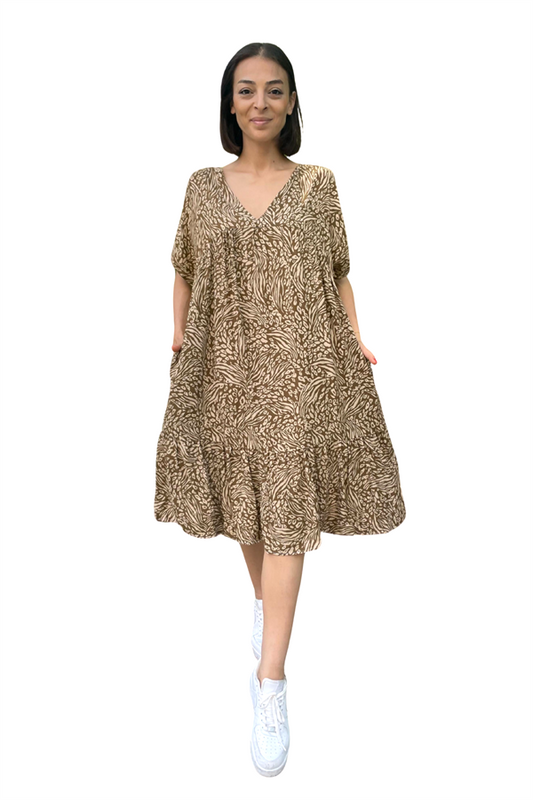Kahverengi Desenli V Yaka Etekleri Fırfırlı Cepli Elbise