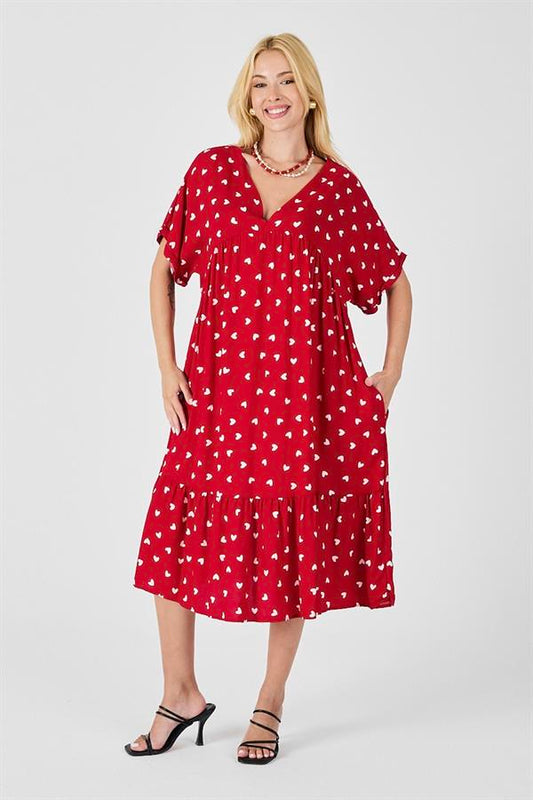 Kırmızı Kalpli V Yaka Etekleri Fırfırlı Cepli Elbise