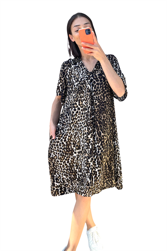 Leopar Desenli Gömlek Yaka Cepli Kısa Elbise
