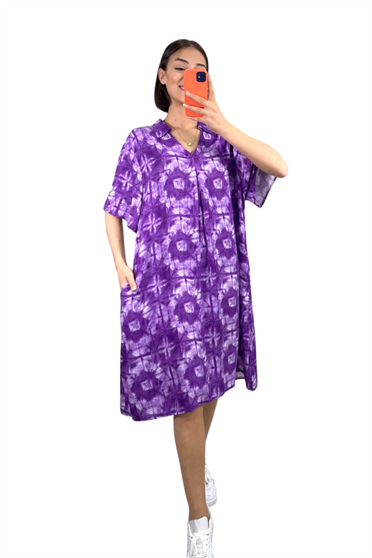Mor Desenli Gömlek Yaka Cepli Kısa Elbise
