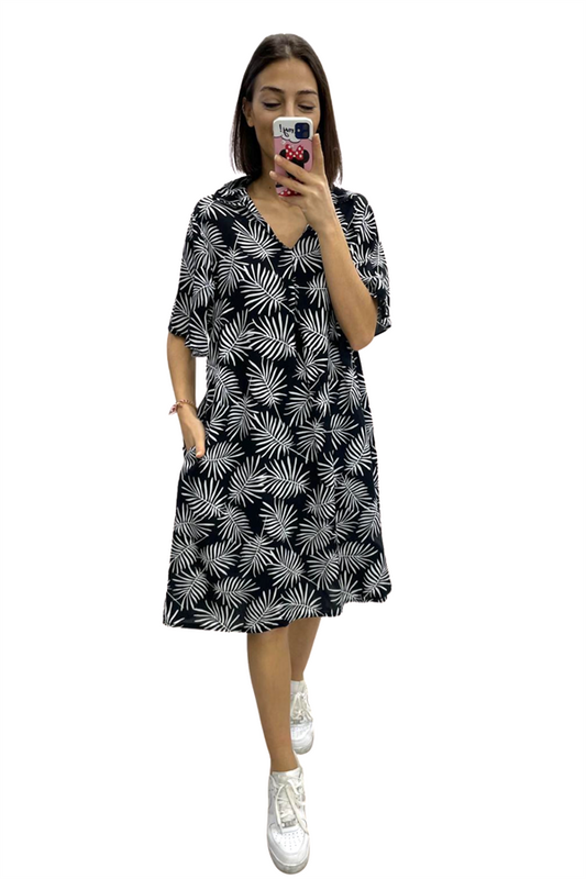 Siyah Desenli Gömlek Yaka Cepli Kısa Elbise