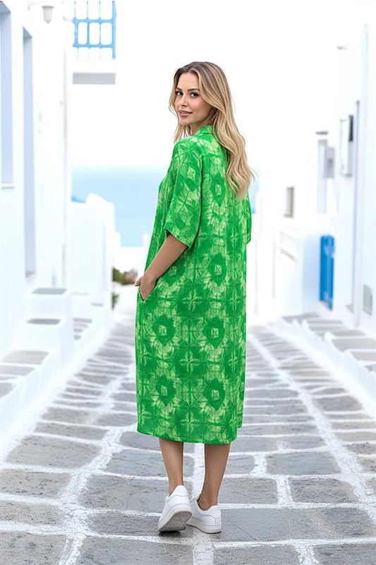 Yeşil Desenli Gömlek Yaka Cepli Kısa Elbise