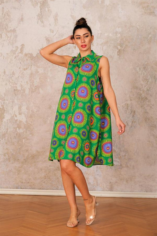 Yeşil Etnik Desenli Kolsuz Kısa Gömlek Elbise