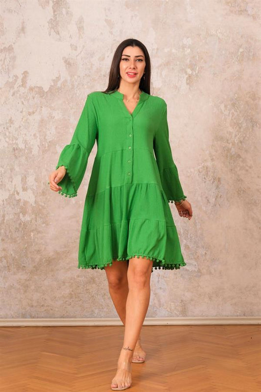 Yeşil V Yaka Önden Düğmeli Kolları Volanlı Ponponlu Kısa Elbise