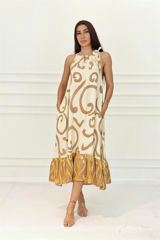 Bej Desenli Boyundan Bağlamalı Cepli Uzun Elbise