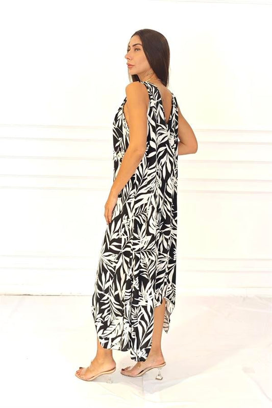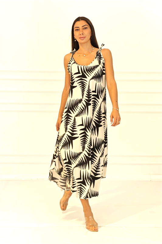 Siyah Beyaz Yaprak Desenli Askısı Halkalı Uzun Elbise