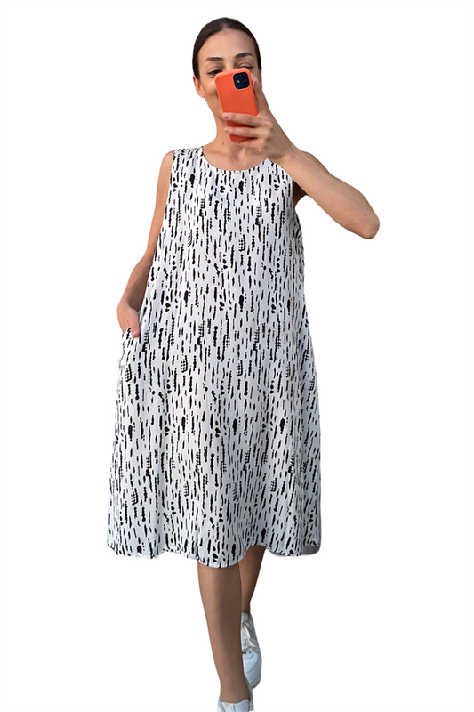 Beyaz Desenli Kalın Askılı Cepli Midi Elbise
