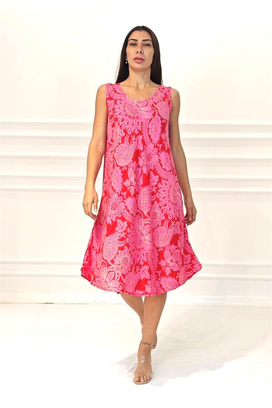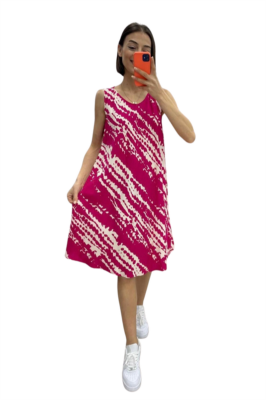Fuşya Balık Desenli Kalın Askılı Cepli Midi Elbise