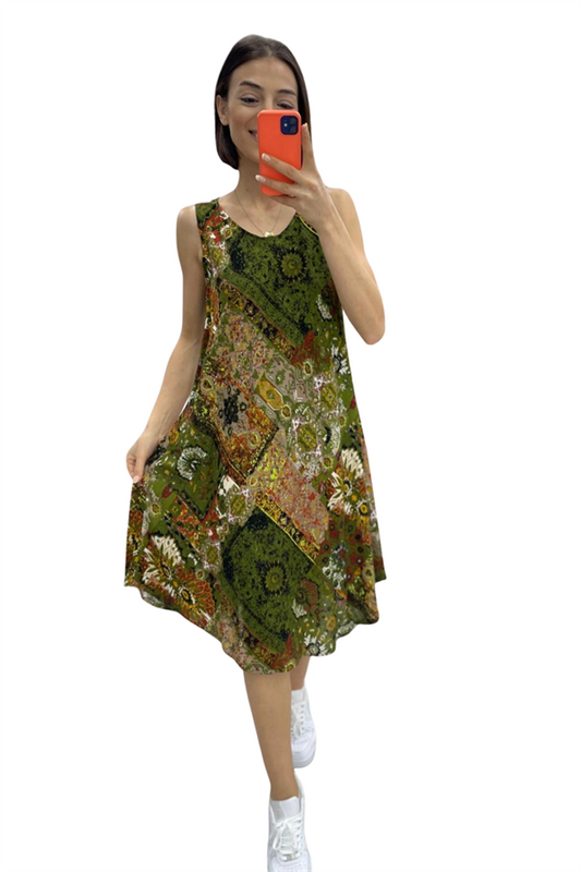 Haki Patchwork Desenli Kalın Askılı Midi Elbise