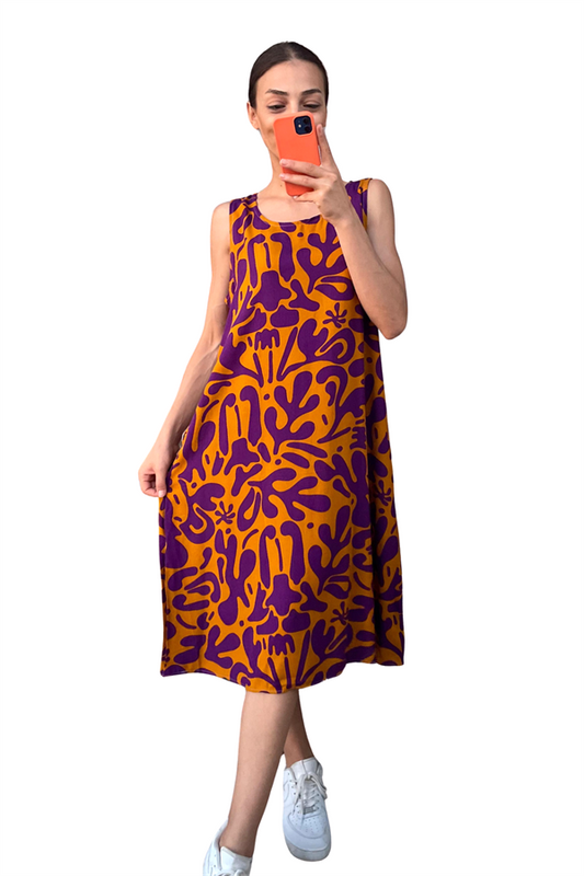 Turuncu Desenli Kalın Askılı Cepli Midi Elbise