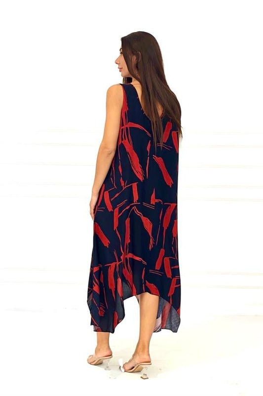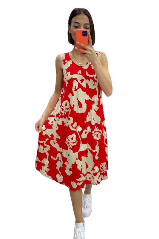 Kırmızı Desenli Kalın Askılı Midi Elbise