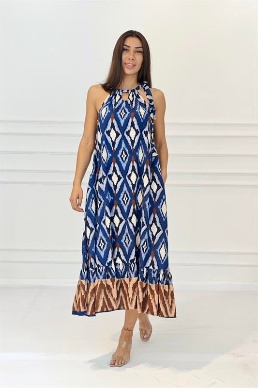 Lacivert Etnik Desenli Boyundan Bağlamalı Cepli Uzun Elbise