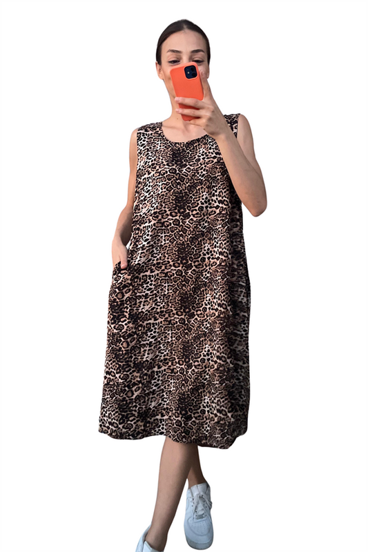 Leopar Desenli Kalın Askılı Cepli Midi Elbise