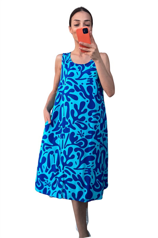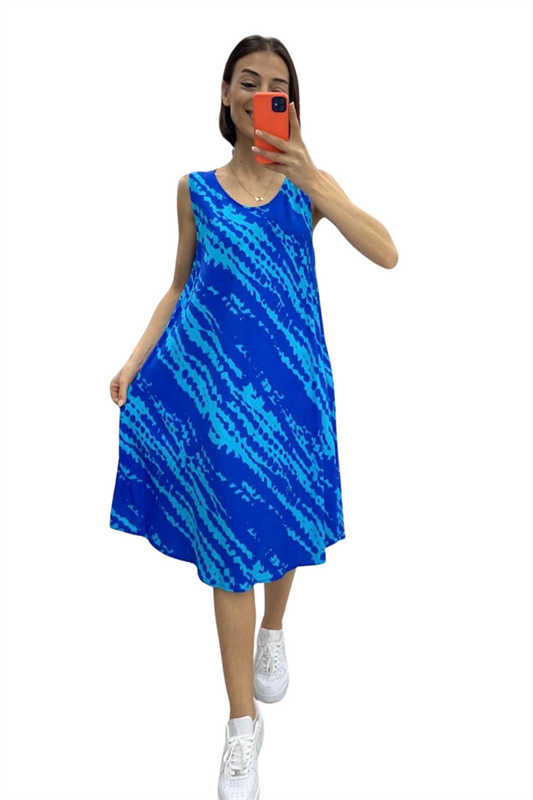 Mavi Etnik Desenli Kalın Askılı Cepli Midi Elbise