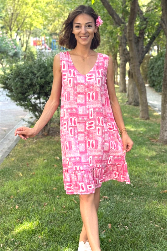 Pembe Desenli Kalın Askılı Fırfırlı Kısa Elbise
