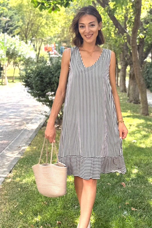 Siyah Çizgili Kalın Askılı Fırfırlı Kısa Elbise