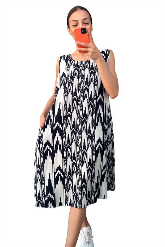Siyah Desenli Kalın Askılı Cepli Midi Elbise