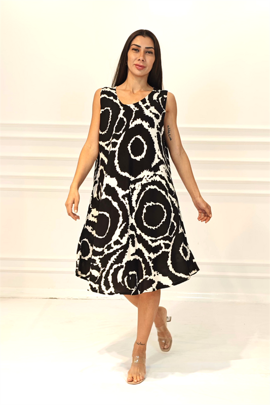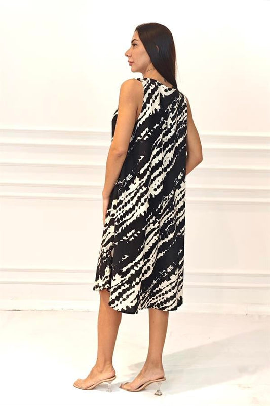 Siyah Desenli Kalın Askılı Midi Elbise
