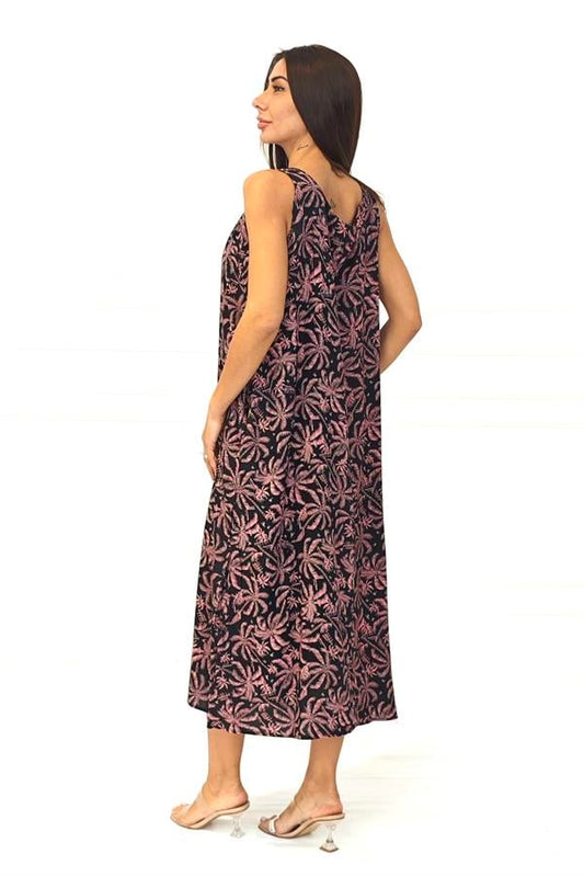 Pembe Desenli Kalın Askılı Midi Elbise