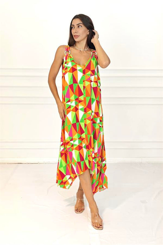 Turuncu Desenli Askısı Halkalı Uzun Elbise