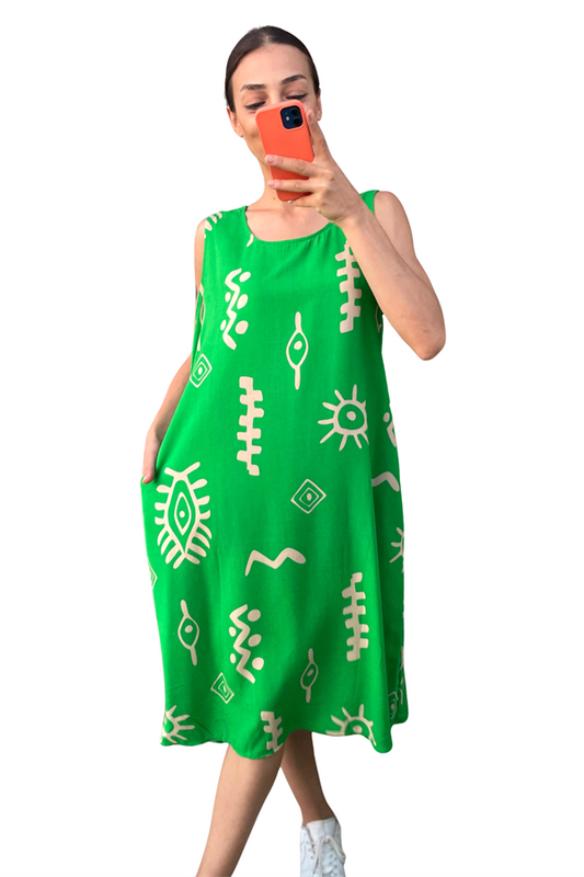 Yeşil Balık Desenli Kalın Askılı Cepli Midi Elbise