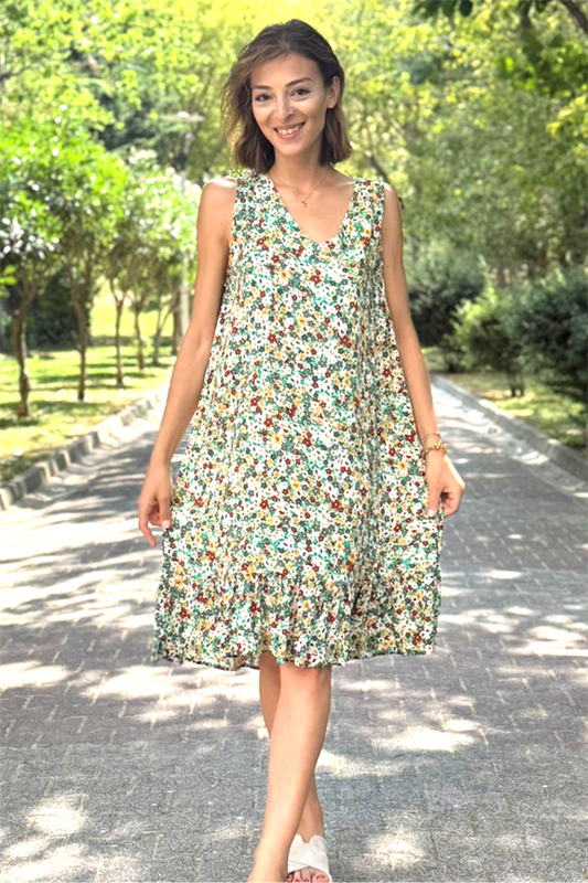 Yeşil Çıtır Çiçek Desenli Kalın Askılı Fırfırlı Kısa Elbise