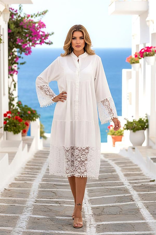Beyaz Önden Düğmeli Kolları Ve Eteği Dantelli Ponponlu Midi Elbise