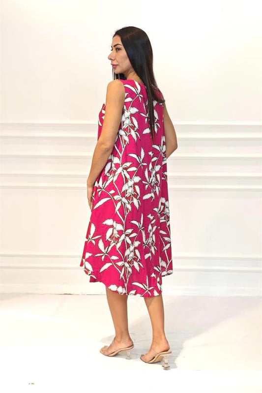 Fuşya Çiçekli U Yaka Askılı Midi Elbise