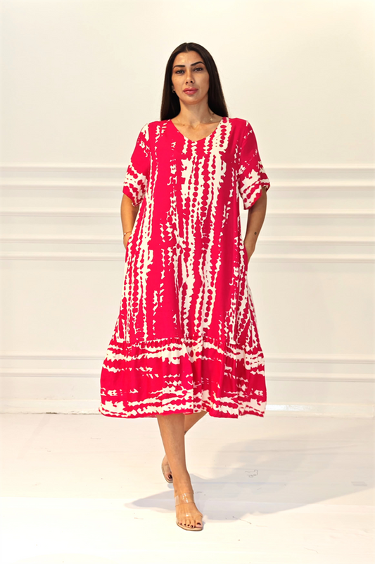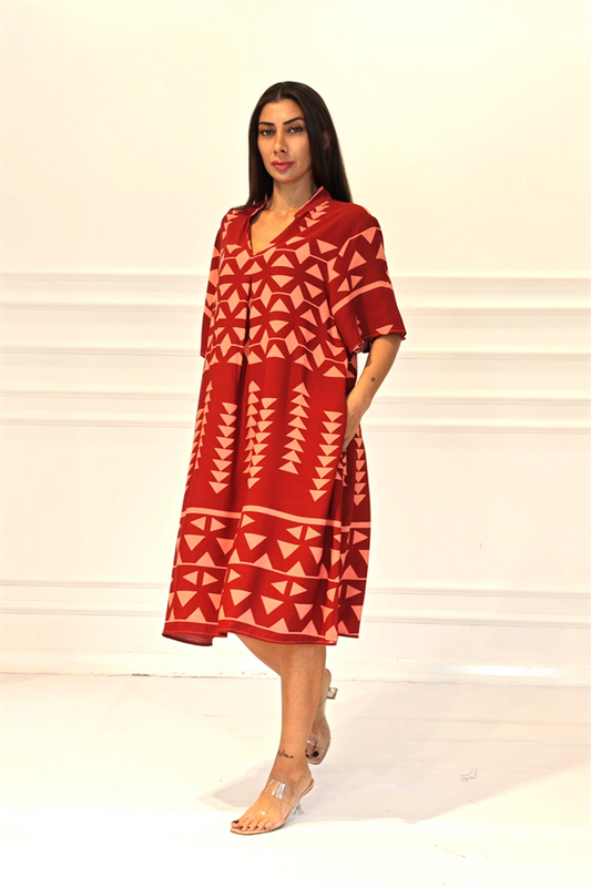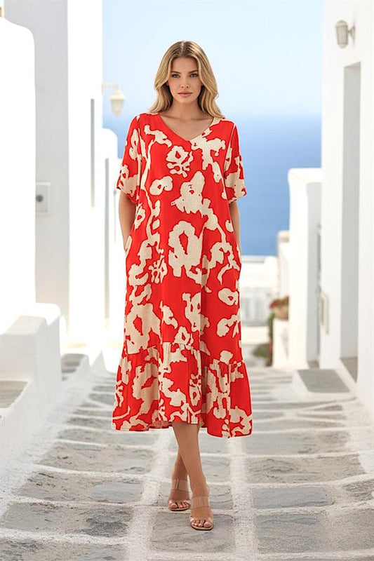 Kırmızı Desenli V Yaka Cepli Etekleri Fırıfırlı Midi Elbise