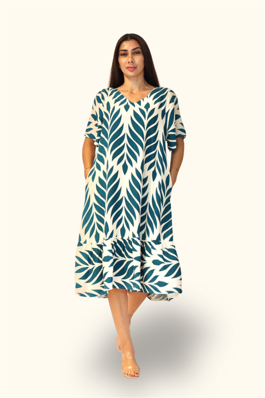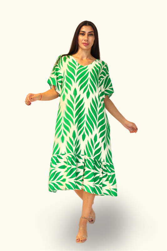 Yeşil Desenli V Yaka Cepli Etekleri Fırıfırlı Midi Elbise