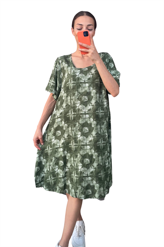 Haki Desenli Yuvarlak Yaka Kısa Kollu Midi Elbise
