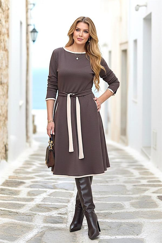 Kahverengi Ekru Biyeli Kuşaklı Elbise