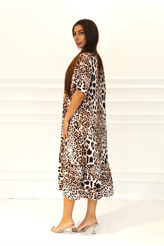 Leopar Desenli V Yaka Cepli Etekleri Fırıfırlı Midi Elbise
