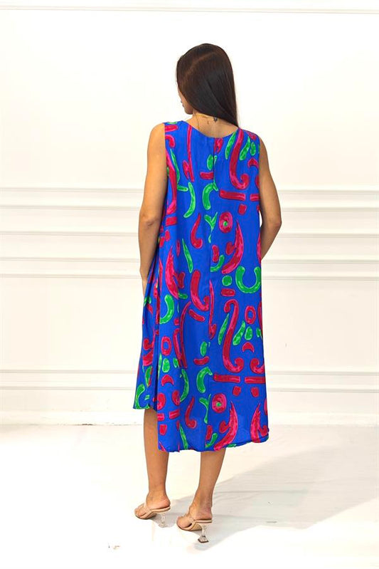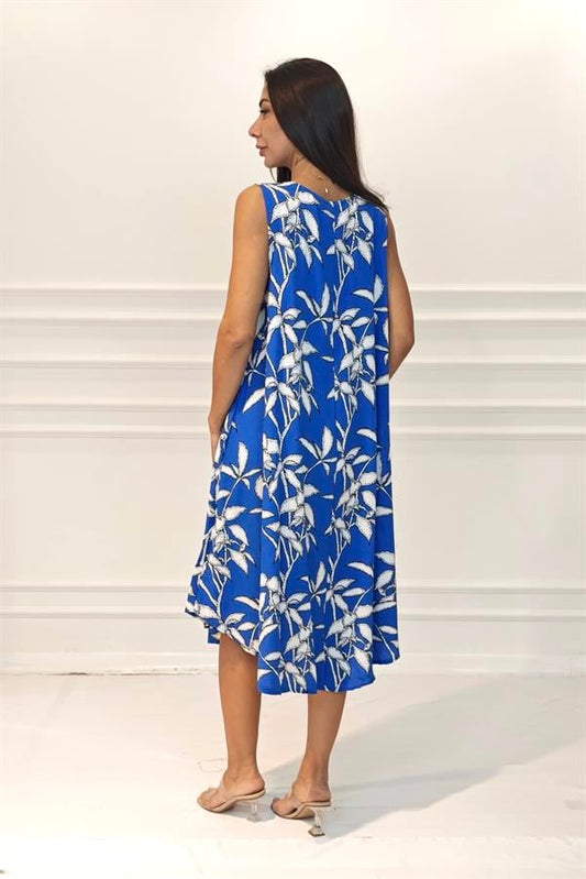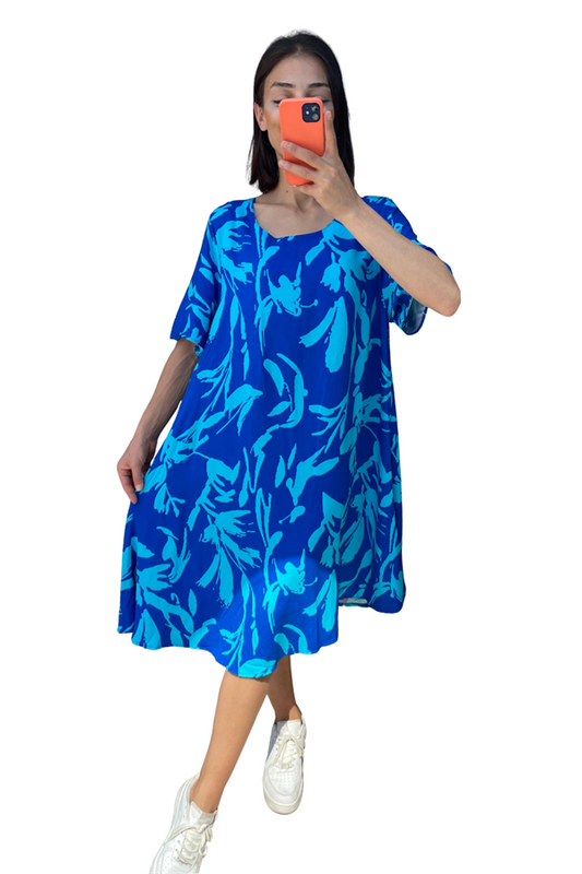 Mavi Desenli Yuvarlak Yaka Kısa Kollu Midi Elbise