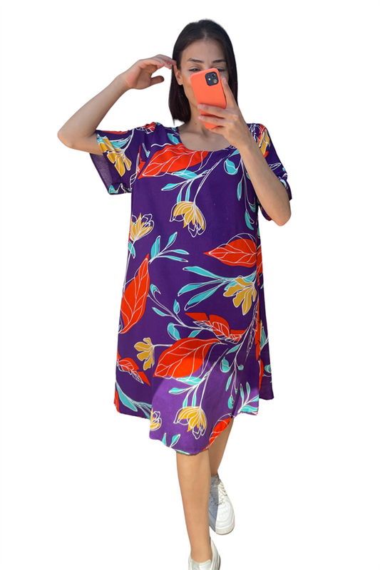 Mor Desenli Yuvarlak Yaka Kısa Kollu Midi Elbise