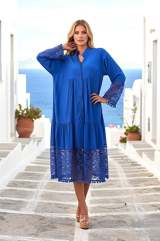 Saks Mavi Önden Düğmeli Kolları Ve Eteği Dantelli Ponponlu Midi Elbise