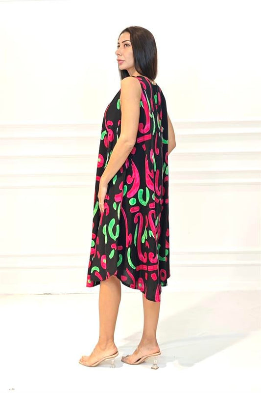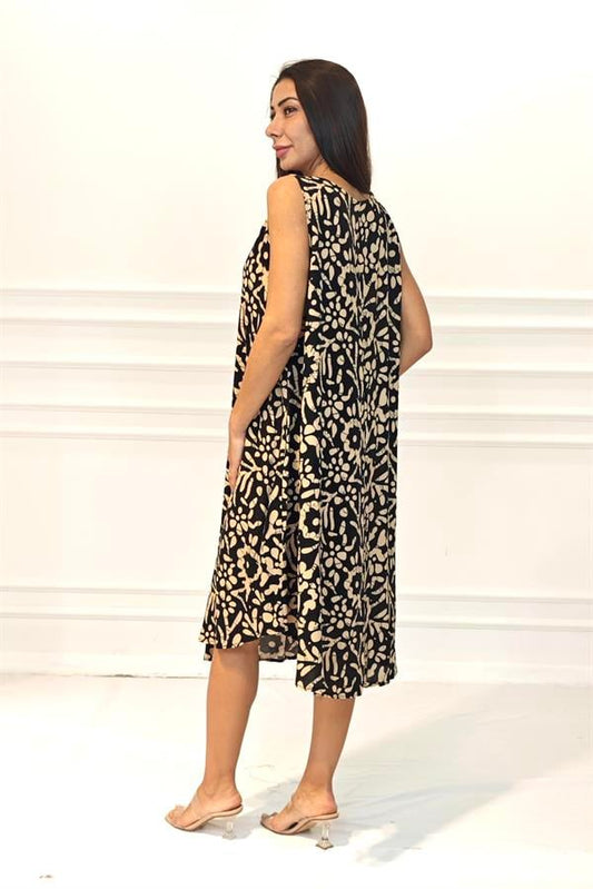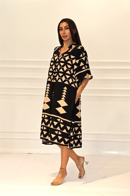 Siyah Desenli Kolsuz Boncuk Detaylı Cepli Midi Elbise
