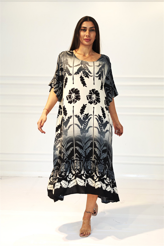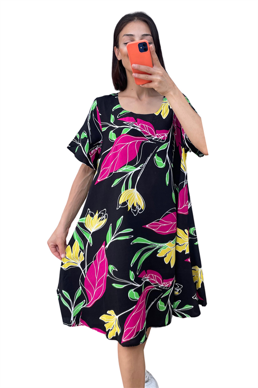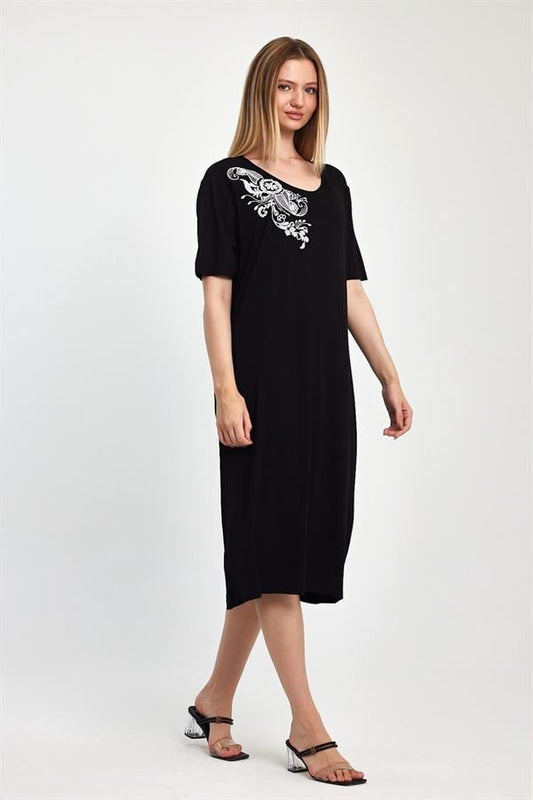 Siyah Desenli Yuvarlak Yaka Kısa Kollu Midi Elbise