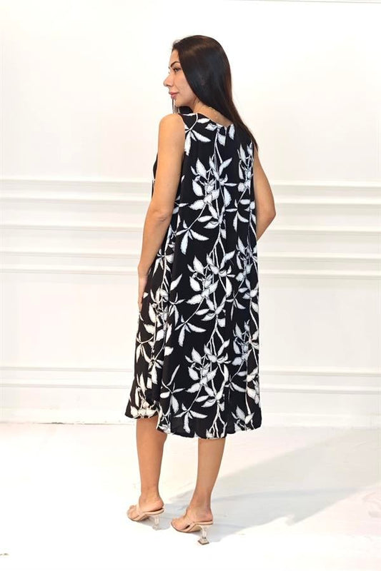 Siyah Desenli U Yaka Askılı Midi Elbise